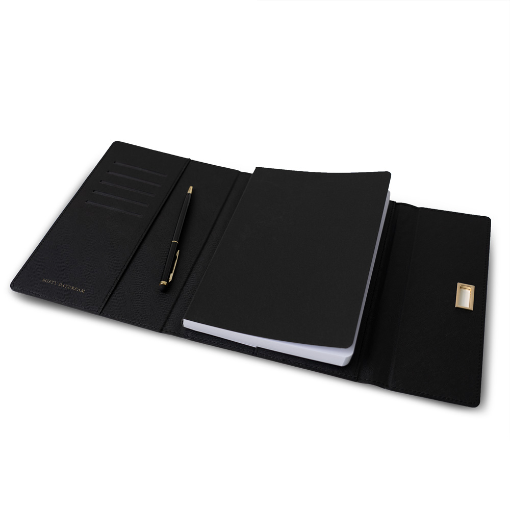 Black leather notebook with premium finish, ideal for corporate gifting and professional use